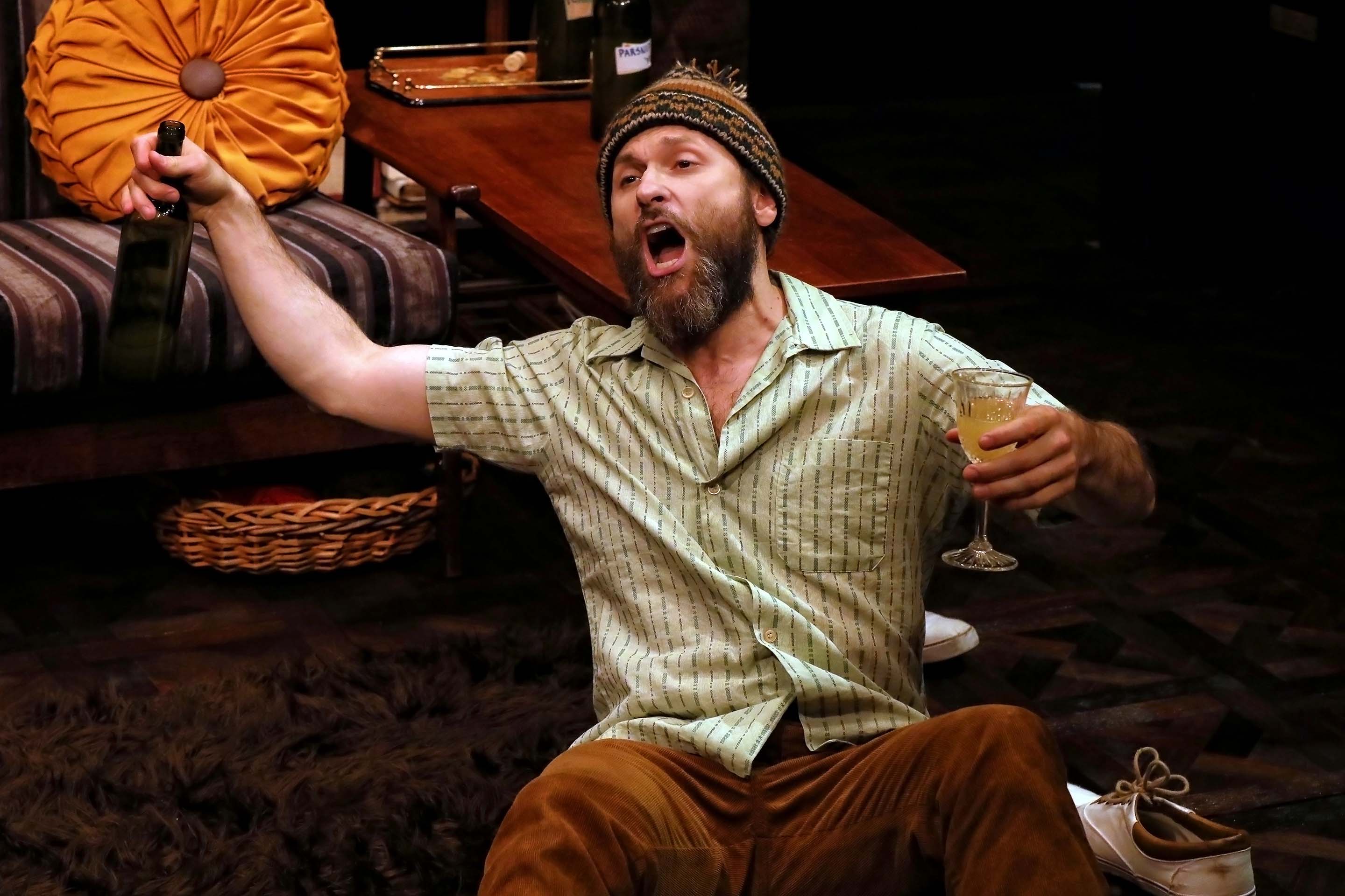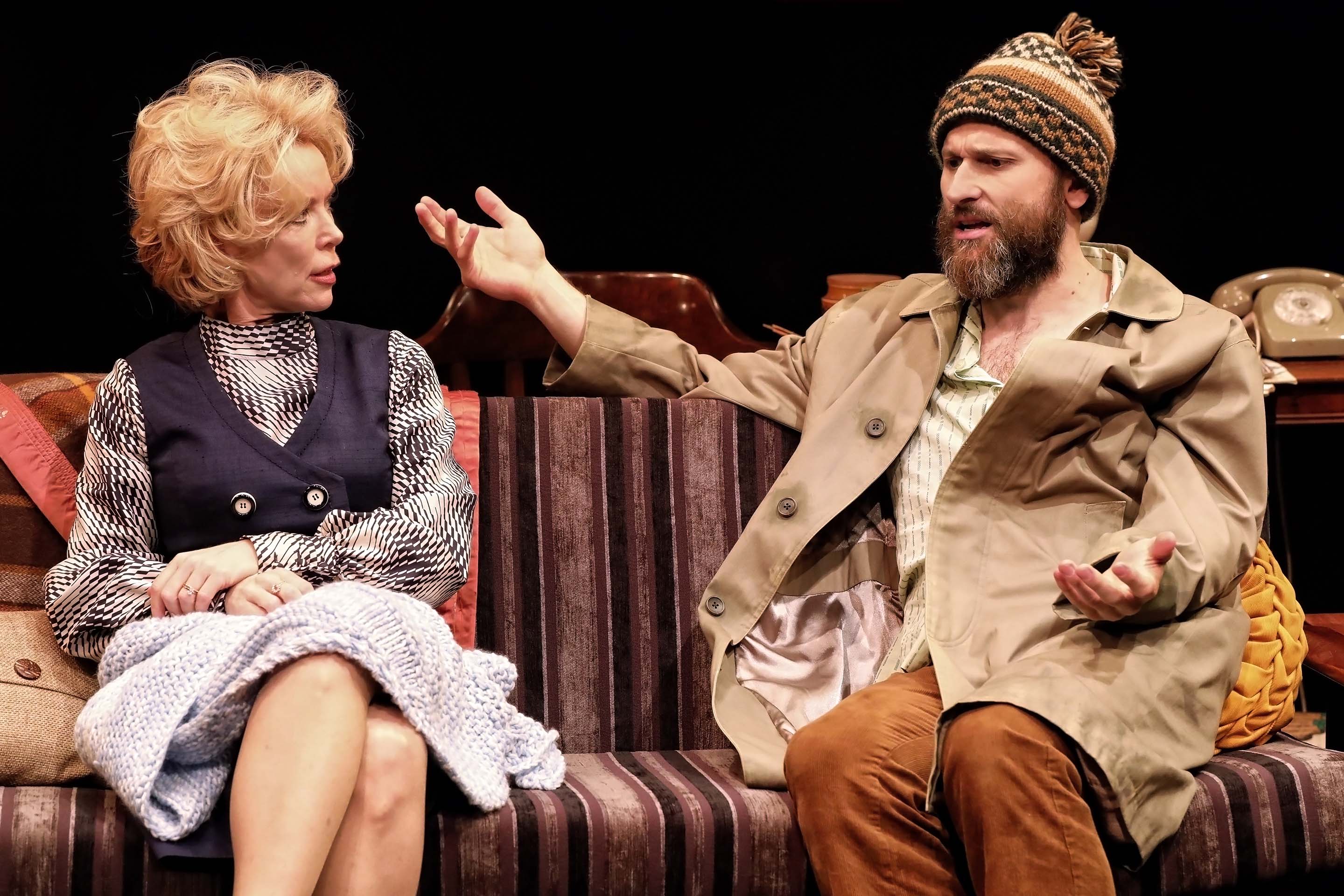 A man with his back to the camera lifts a saucepan while facing a surprised woman in a yellow dress, standing near a sofa covered in patterned blankets in a dimly lit room. Three people stand in front of a sofa, each drinking from a glass. A woman in a cardigan and patterned shirt is on the left, a man in glasses and a tucked-in shirt in the centre, and another man in a beanie and coat on the right. A woman with curly hair stands with arms crossed and a concerned expression, while a bearded man in a beanie and casual clothes reclines on a striped sofa in a cosy, cluttered living room set on stage. A warmly lit stage set depicts a cosy living room with a sofa, armchairs, bookshelves, lamps, and rugs. The text The Norman Conquests is displayed in the upper left corner against a dark background. Three adults sit on a sofa, laughing and interacting while playing a board game on a coffee table in front of them. They appear relaxed and joyful, surrounded by cosy lamps and cushions. A bearded man in a winter hat speaks on a beige rotary phone, gesturing with his hand, while three other men sit nearby, two with heads lowered, all in a dimly lit room with a dark background. Four adults sit around a table playing a board game. One woman looks concerned, another listens intently, while a man in a striped tie leans forward, speaking passionately. A bookcase is in the background. Two men are having a serious conversation in a dimly lit room. One man faces away from the camera, while the other, wearing glasses and a tucked-in shirt, looks at him with a concerned expression. A bearded man wearing a knitted hat sits on the floor, holding a wine bottle in one hand and a glass in the other, with his mouth open as if shouting or singing. Shoes and a furry rug are nearby. A woman with blonde hair angrily points her finger at a bearded man in a knitted hat sitting with arms crossed on a striped sofa; a lamp and blankets are in the background. A woman and a bearded man sit on a striped sofa in conversation; the woman wears a dress and holds a blanket, while the man gestures expressively, wearing a knitted hat and trench coat. A bearded man wearing a knitted hat and casual clothes lounges on a chair, resting his head on one hand. An old, weathered suitcase sits on his lap, and a textured blanket covers the armrest. The background is dark.