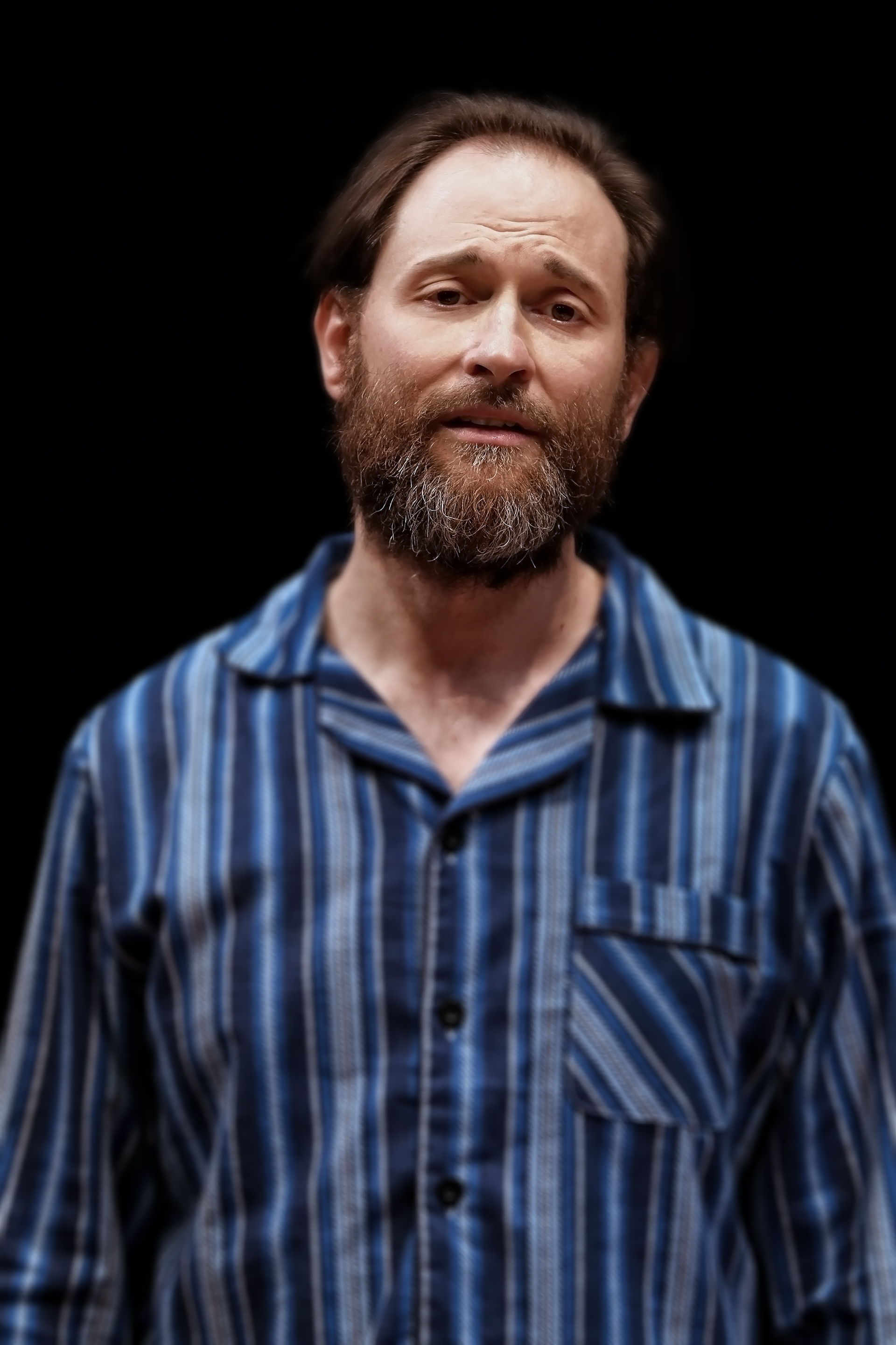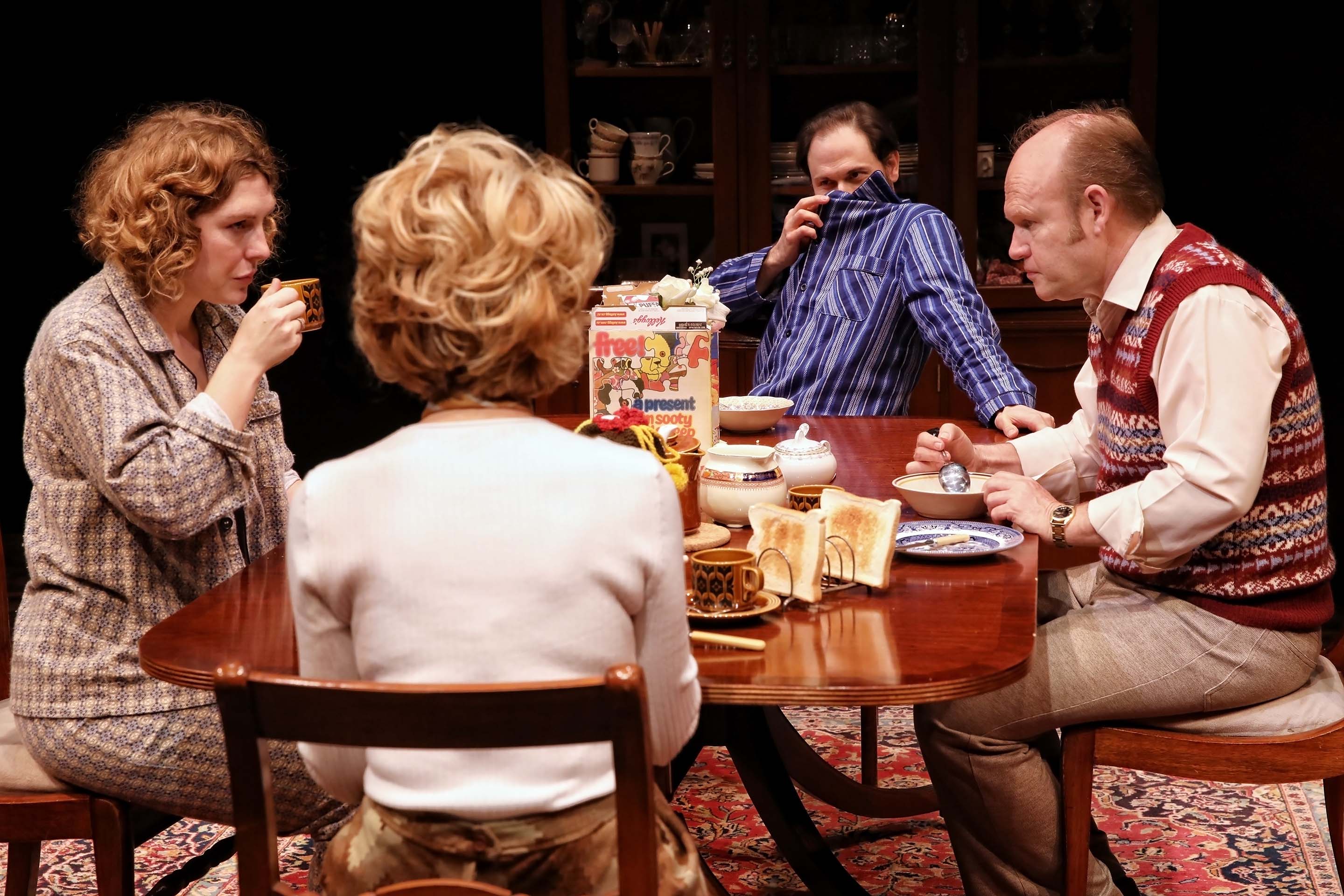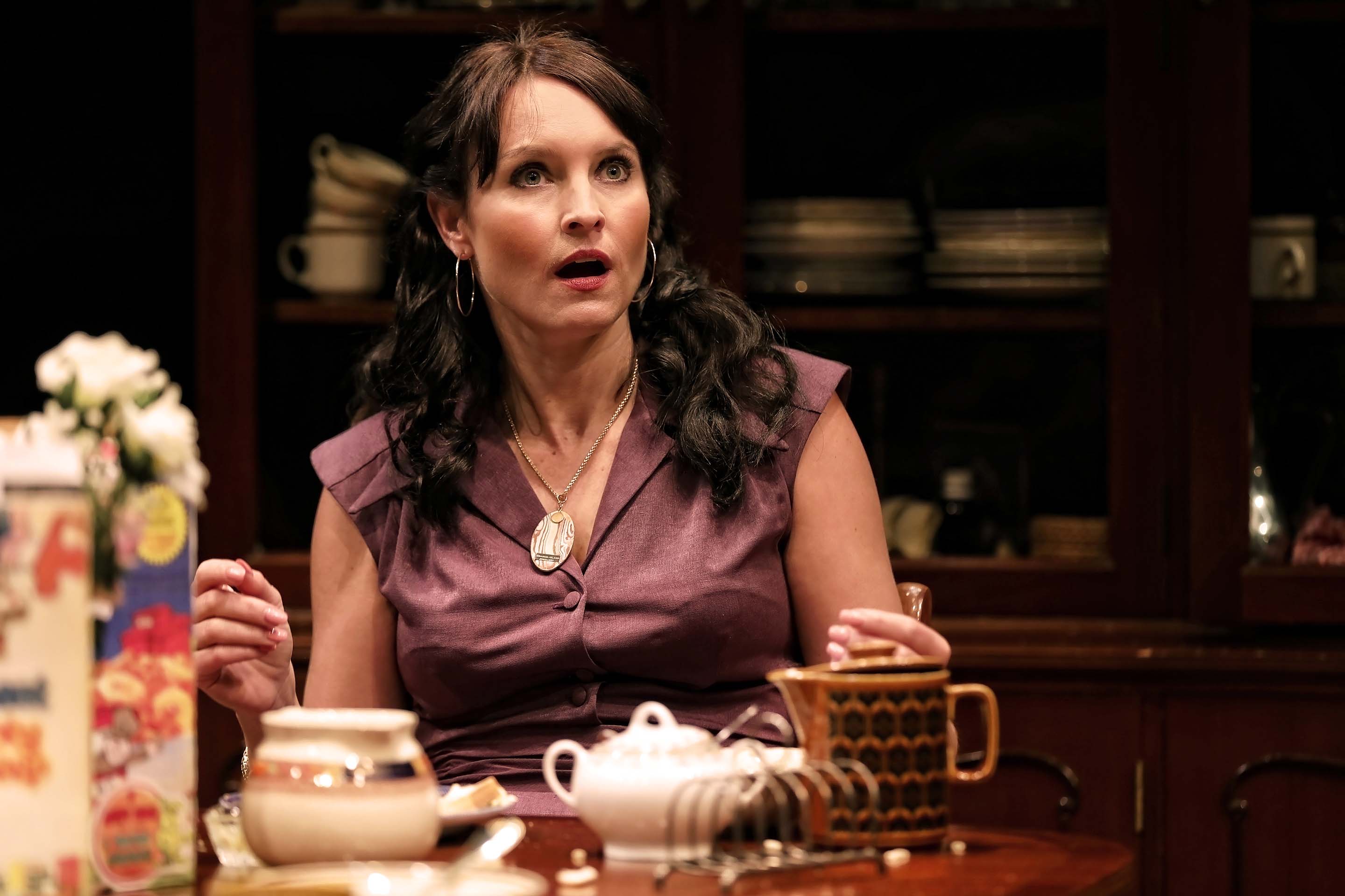 Two women are in a dining room; one stands confidently in the foreground with arms folded and a smile, while the other stands behind a wooden table, arranging crockery and looking forwards. Three actors perform a dramatic scene in a dining room; a man in a checked jacket and tie stands holding a dish, a woman in a floral blouse looks concerned, and an older woman sits at the table with her hand on her chest. Three actors perform a dramatic scene in a dining room setting. A man sits holding a cabbage, while two women stand; one looks surprised, the other faces away. A table with food and a wooden cupboard are in the background. Four adults sit around a wooden dining table, raising glasses in a toast. The table is laid with plates of food, a wine bottle, and a flower vase. They appear to be engaged in a formal dinner gathering. Four adults sit around a wooden dining table set with breakfast items, including toast, tea, and cereal. One man covers his nose with his shirt, while the others look serious or contemplative. A man in striped pyjamas gestures animatedly at a woman sitting at a table set with breakfast items, including cereal boxes, flowers, and a cockerel figurine. The woman looks at him with a serious expression. A man in a suit and a woman in a pink dressing gown sit opposite each other at a wooden dining table set with flowers, cups, and dishes, appearing to have a serious conversation in a warmly lit room. Two men sit at a breakfast table. One man in a striped shirt smiles broadly with raised fists, celebrating. The other man, wearing a jumper vest, looks away pensively. Toast, cereal boxes, and pastries are on the table. A woman with long dark hair, wearing a purple sleeveless blouse and a pendant necklace, sits at a table set with tea things, looking surprised or shocked, with crockery and a dark cupboard in the background. A bearded man in a suit, holding a piece of toast and smiling, sits at a table with a woman. The table is set with a teapot, cake, flowers, and various dishes; the scene appears to be from a stage play. Three people sit around a dining table with teacups, plates, and a flower vase. One man stands holding food, another sits looking serious, and a woman in a satin dressing gown holds a teacup, facing away from the camera. A man with a beard and moustache wearing a blue striped shirt stands against a black background, looking slightly up with a neutral or contemplative expression. Two women in vintage clothing are in a dining room. One stands, pointing sternly, whilst the other sits at the table looking upset, clutching a serviette. The table is laid with flowers, glassware, and empty plates. A man with glasses and a moustache, wearing a light blue short-sleeve button-up shirt and beige trousers, stands and smiles next to a table with a small bouquet of flowers. The background is dark.