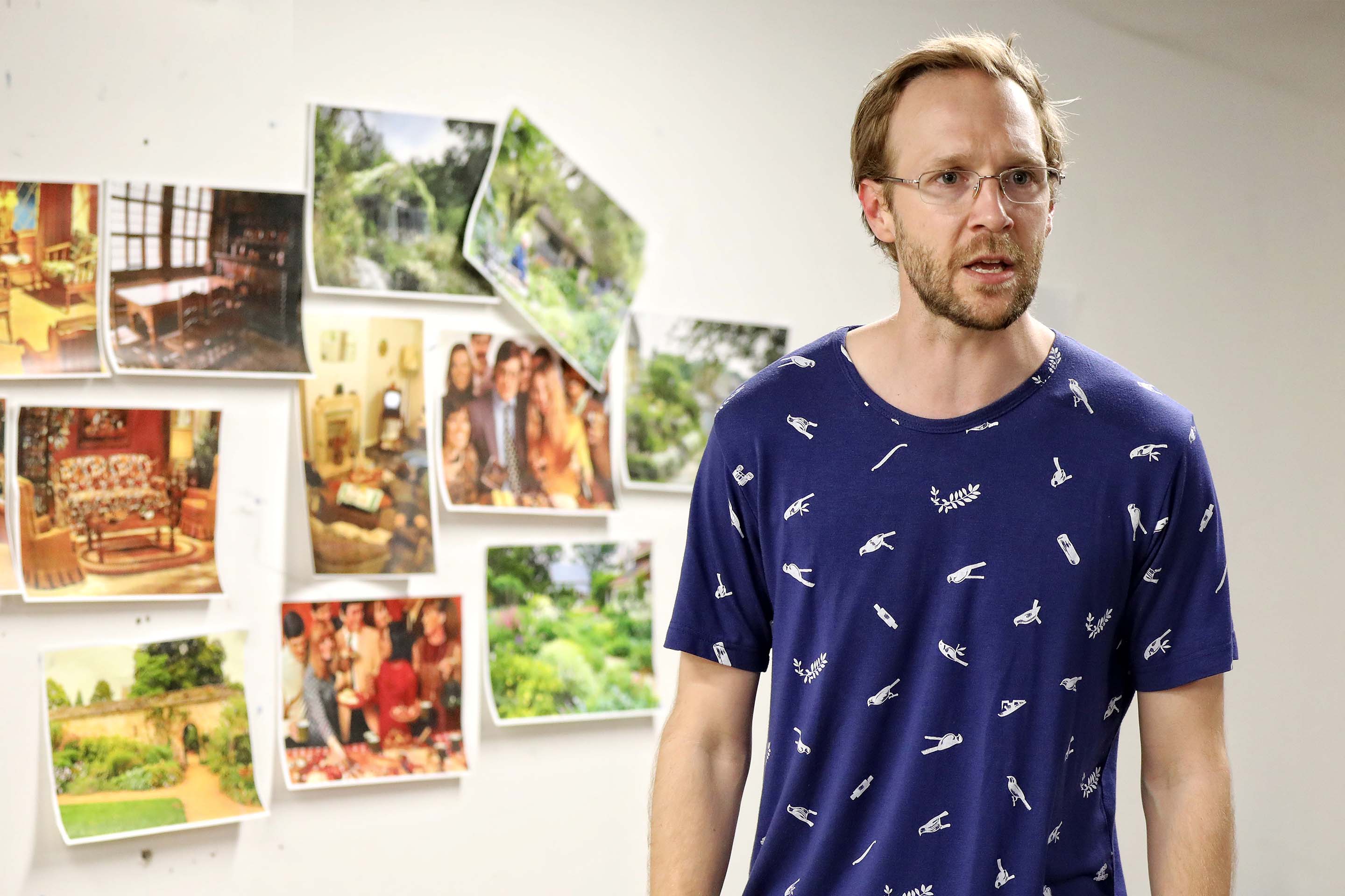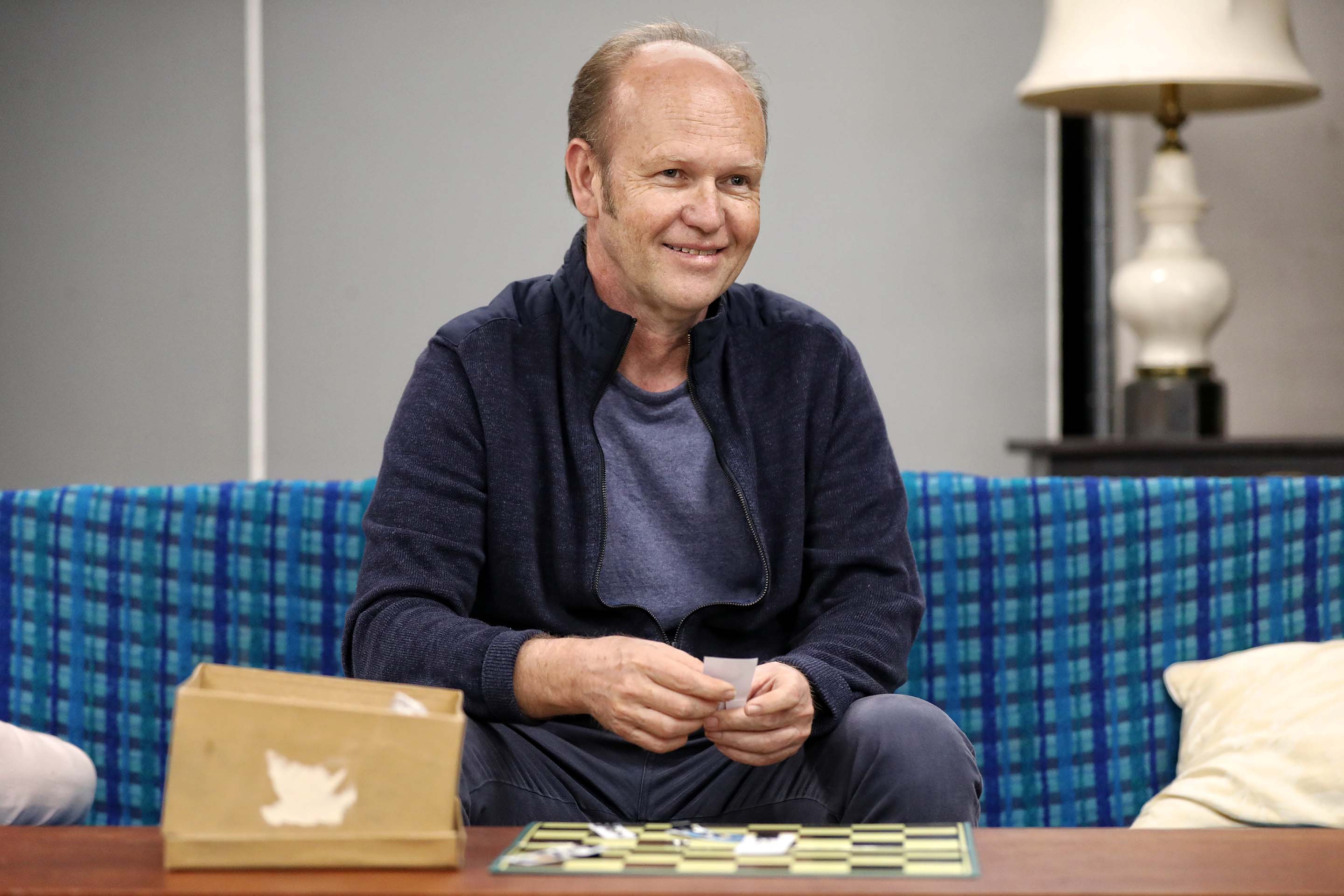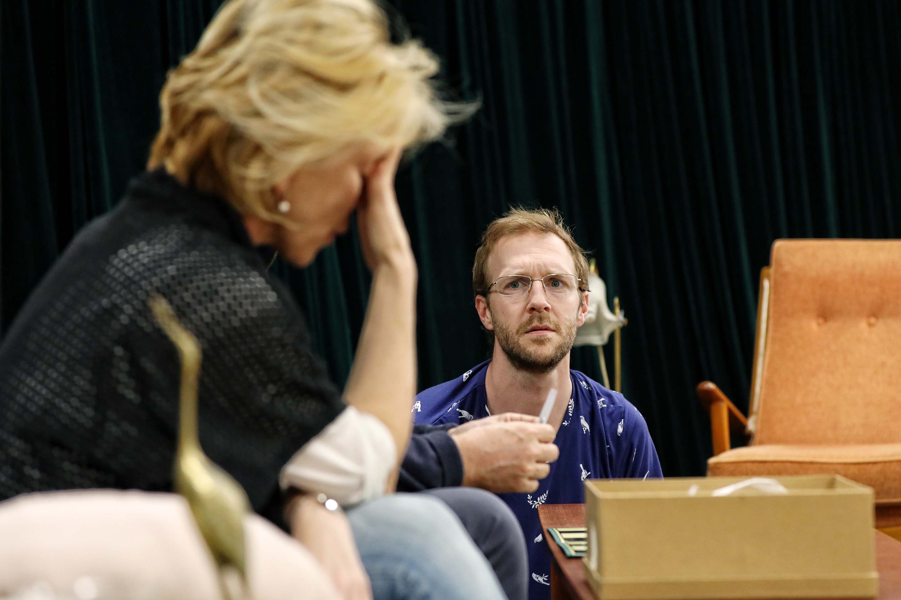 A man with a beard wearing a navy knitted hat and dark shirt is lying on his side on a carpeted floor with his eyes closed, appearing to be asleep or unconscious. A man in a beige coat and blue winter hat with a red bobble stands indoors, holding his hands to his chin and looking thoughtful. Coat hangers and a sign that says Garden are visible in the background. Three women sit indoors; one at the front uses a laptop, another in glasses looks down, and a third in a pink shirt leans forward, gazing attentively to the side. A middle-aged man with short hair sits on a blue checked sofa, smiling and holding a piece of paper. A box and a game board are on the wooden coffee table in front of him, and a lamp is in the background. A woman with blonde hair stands next to a sign that says Bedrooms Rest of house, holding a light blue textured blanket and looking to the side with a thoughtful expression. A man with glasses and a blue patterned shirt stands in front of a wall with several colourful photos of gardens, rooms, and groups of people pinned on it. He appears to be talking or presenting. A woman with short blonde hair sits on a blue checked sofa, looking to the side while holding an open red box on her lap. There is a table with a lamp and a cushion in the background. A woman in a pink blouse and a man in a grey blazer sit close together on a blue chequered sofa, smiling warmly and looking into each other's eyes, creating a friendly and intimate atmosphere. Three women stand indoors; one in focus at centre wearing a black jumper, looking forward, while the two others, in casual and business attire, are blurred in the background beside a blue checked sofa. Four adults are in a room; one man at the front puts on a jacket and wears a beanie, while a woman laughs, another man sits on a sofa, and a woman at the back talks on the phone. The setting looks like a casual rehearsal or meeting. A woman with curly hair sits on a bench by a table with a lamp, wearing a jumper and looking pensive with her hand covering her mouth. A woman with long, wavy, light brown and pink hair is sitting on a sofa, using a silver MacBook laptop. She is wearing a white shirt and a black hoodie. A blurred person is in the foreground. Three people sit on a blue checked sofa holding mugs, looking serious. A fourth person sits in the background, also looking thoughtful. The scene suggests a tense or contemplative moment. A woman sits with her hand covering her face, looking distressed, whilst a man kneels nearby, gazing at her with concern. They are indoors, next to an orange chair and a table with a box on it. A woman with wavy, tousled blonde hair and a pensive expression sits indoors, wearing a sleeveless black top. The background is blurred, showing indistinct people and furniture. Three people sit at a cluttered desk, laughing and smiling. The group includes two women and one man, surrounded by papers, cups, and water bottles in a brightly lit room with shelves and office supplies. A man in a blue jacket stands in the foreground, while a woman holding a blue shirt stands behind him. Both have serious expressions and are indoors with a blurred background. Four sheets of paper display fashion sketches of women wearing vintage-style outfits in light colours, with some designs outlined in pencil and partially coloured with blue, brown, or beige watercolour. A beige rotary-style landline telephone sits on a dark surface next to a wooden organiser holding letters, envelopes, and a pair of scissors. An ashtray is also visible on the right side of the image. A glass decanter, two empty cocktail glasses, two vintage mugs with floral designs, and a brass crane figurine are arranged on a green surface, with cushions and blurred furniture in the background. A framed photo of a woman and child sits on a table beside empty green wine bottles, a white teapot with a floral design, a wine glass, and a serving tray, all set against a dark background. A cluttered desk with a handwritten and doodled script titled The Norman Conquests: Table Manners, surrounded by papers, a pen, a wristwatch, a bulldog clip, a notepad, and a partially eaten piece of bread. A glass-fronted wooden cupboard displays stacked plates and decorative glassware. Through the glass, yellow flowers and sunlight are visible in the background, casting a warm, cosy ambience. A wooden china cabinet with glass doors displays assorted glassware, teacups, teapots, and stacked plates on its shelves. The arrangement is neat, with reflective surfaces enhancing the elegant, vintage look. Three people are in a cluttered room. Two are standing and appear to be arguing, while a third person sits on a blue sofa between them, looking concerned. There is a coffee table with items on it in front of the sofa. An older man gently touches the face of a younger man wearing an apron and dark shirt. They stand indoors, facing each other, in what appears to be a rehearsal or informal setting. A woman in a pink blouse smiles and gestures with her arm whilst speaking to a man with grey hair in a room with art and photos on the wall. A woman in a pink shirt smiles whilst raising her hand towards an older man with grey hair, who has his back to the camera. Photos are pinned to the wall behind them. A man with a beard wears a blue and red knitted hat and a green trench coat, holding a printed magazine or newspaper in one hand, standing in front of a dark curtain. A woman with straight brown hair wearing a mauve button-up shirt stands against a plain grey background, looking at the camera with a neutral expression. A group of people in a casual, creative workspace. Some are sitting and chatting, one woman is laughing on an armchair, and another stands smiling in the foreground. Various work materials and computers are visible in the background. A man and woman lie on a rug, laughing and embracing each other. The scene appears indoors, with retro furniture, cushions, and a blue sofa in the backgrou