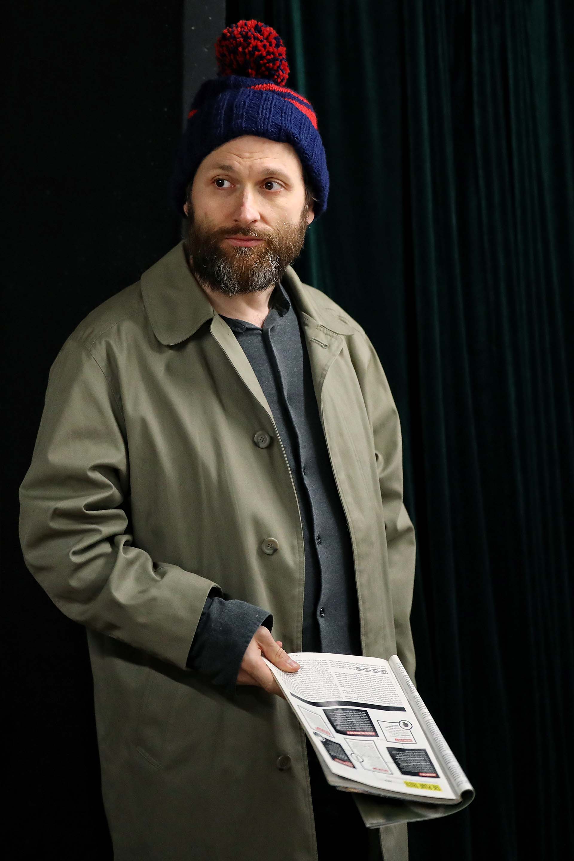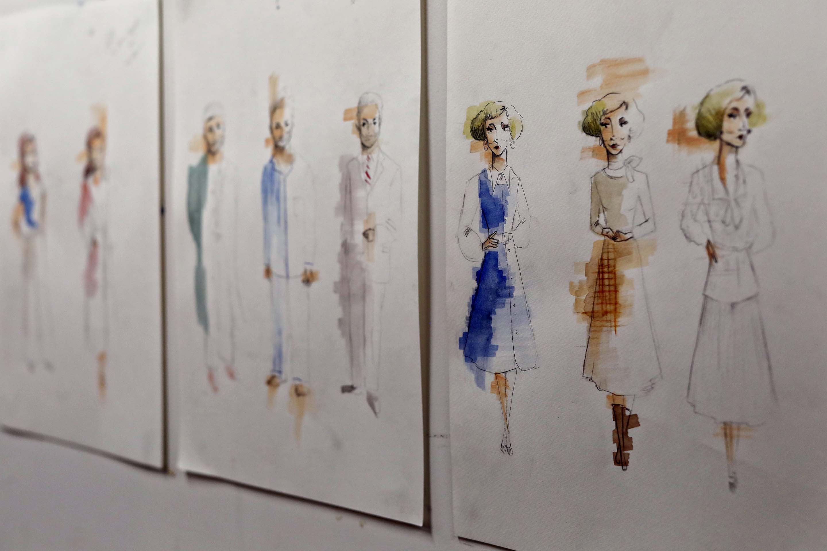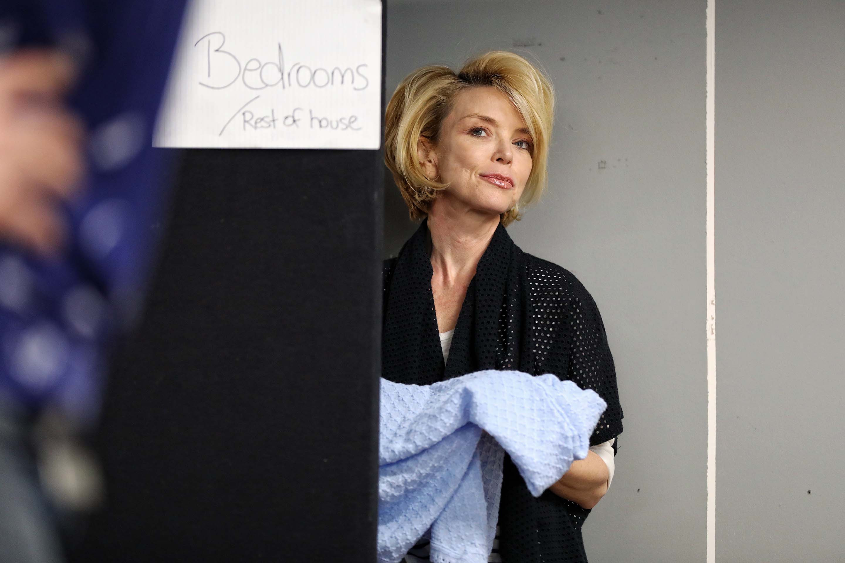 A man with a beard wearing a navy knitted hat and dark shirt is lying on his side on a carpeted floor with his eyes closed, appearing to be asleep or unconscious. A man in a beige coat and blue winter hat with a red bobble stands indoors, holding his hands to his chin and looking thoughtful. Coat hangers and a sign that says Garden are visible in the background. Three women sit indoors; one at the front uses a laptop, another in glasses looks down, and a third in a pink shirt leans forward, gazing attentively to the side. A middle-aged man with short hair sits on a blue checked sofa, smiling and holding a piece of paper. A box and a game board are on the wooden coffee table in front of him, and a lamp is in the background. A woman with blonde hair stands next to a sign that says Bedrooms Rest of house, holding a light blue textured blanket and looking to the side with a thoughtful expression. A man with glasses and a blue patterned shirt stands in front of a wall with several colourful photos of gardens, rooms, and groups of people pinned on it. He appears to be talking or presenting. A woman with short blonde hair sits on a blue checked sofa, looking to the side while holding an open red box on her lap. There is a table with a lamp and a cushion in the background. A woman in a pink blouse and a man in a grey blazer sit close together on a blue chequered sofa, smiling warmly and looking into each other's eyes, creating a friendly and intimate atmosphere. Three women stand indoors; one in focus at centre wearing a black jumper, looking forward, while the two others, in casual and business attire, are blurred in the background beside a blue checked sofa. Four adults are in a room; one man at the front puts on a jacket and wears a beanie, while a woman laughs, another man sits on a sofa, and a woman at the back talks on the phone. The setting looks like a casual rehearsal or meeting. A woman with curly hair sits on a bench by a table with a lamp, wearing a jumper and looking pensive with her hand covering her mouth. A woman with long, wavy, light brown and pink hair is sitting on a sofa, using a silver MacBook laptop. She is wearing a white shirt and a black hoodie. A blurred person is in the foreground. Three people sit on a blue checked sofa holding mugs, looking serious. A fourth person sits in the background, also looking thoughtful. The scene suggests a tense or contemplative moment. A woman sits with her hand covering her face, looking distressed, whilst a man kneels nearby, gazing at her with concern. They are indoors, next to an orange chair and a table with a box on it. A woman with wavy, tousled blonde hair and a pensive expression sits indoors, wearing a sleeveless black top. The background is blurred, showing indistinct people and furniture. Three people sit at a cluttered desk, laughing and smiling. The group includes two women and one man, surrounded by papers, cups, and water bottles in a brightly lit room with shelves and office supplies. A man in a blue jacket stands in the foreground, while a woman holding a blue shirt stands behind him. Both have serious expressions and are indoors with a blurred background. Four sheets of paper display fashion sketches of women wearing vintage-style outfits in light colours, with some designs outlined in pencil and partially coloured with blue, brown, or beige watercolour. A beige rotary-style landline telephone sits on a dark surface next to a wooden organiser holding letters, envelopes, and a pair of scissors. An ashtray is also visible on the right side of the image. A glass decanter, two empty cocktail glasses, two vintage mugs with floral designs, and a brass crane figurine are arranged on a green surface, with cushions and blurred furniture in the background. A framed photo of a woman and child sits on a table beside empty green wine bottles, a white teapot with a floral design, a wine glass, and a serving tray, all set against a dark background. A cluttered desk with a handwritten and doodled script titled The Norman Conquests: Table Manners, surrounded by papers, a pen, a wristwatch, a bulldog clip, a notepad, and a partially eaten piece of bread. A glass-fronted wooden cupboard displays stacked plates and decorative glassware. Through the glass, yellow flowers and sunlight are visible in the background, casting a warm, cosy ambience. A wooden china cabinet with glass doors displays assorted glassware, teacups, teapots, and stacked plates on its shelves. The arrangement is neat, with reflective surfaces enhancing the elegant, vintage look. Three people are in a cluttered room. Two are standing and appear to be arguing, while a third person sits on a blue sofa between them, looking concerned. There is a coffee table with items on it in front of the sofa. An older man gently touches the face of a younger man wearing an apron and dark shirt. They stand indoors, facing each other, in what appears to be a rehearsal or informal setting. A woman in a pink blouse smiles and gestures with her arm whilst speaking to a man with grey hair in a room with art and photos on the wall. A woman in a pink shirt smiles whilst raising her hand towards an older man with grey hair, who has his back to the camera. Photos are pinned to the wall behind them. A man with a beard wears a blue and red knitted hat and a green trench coat, holding a printed magazine or newspaper in one hand, standing in front of a dark curtain. A woman with straight brown hair wearing a mauve button-up shirt stands against a plain grey background, looking at the camera with a neutral expression. A group of people in a casual, creative workspace. Some are sitting and chatting, one woman is laughing on an armchair, and another stands smiling in the foreground. Various work materials and computers are visible in the background. A man and woman lie on a rug, laughing and embracing each other. The scene appears indoors, with retro furniture, cushions, and a blue sofa in the backgrou