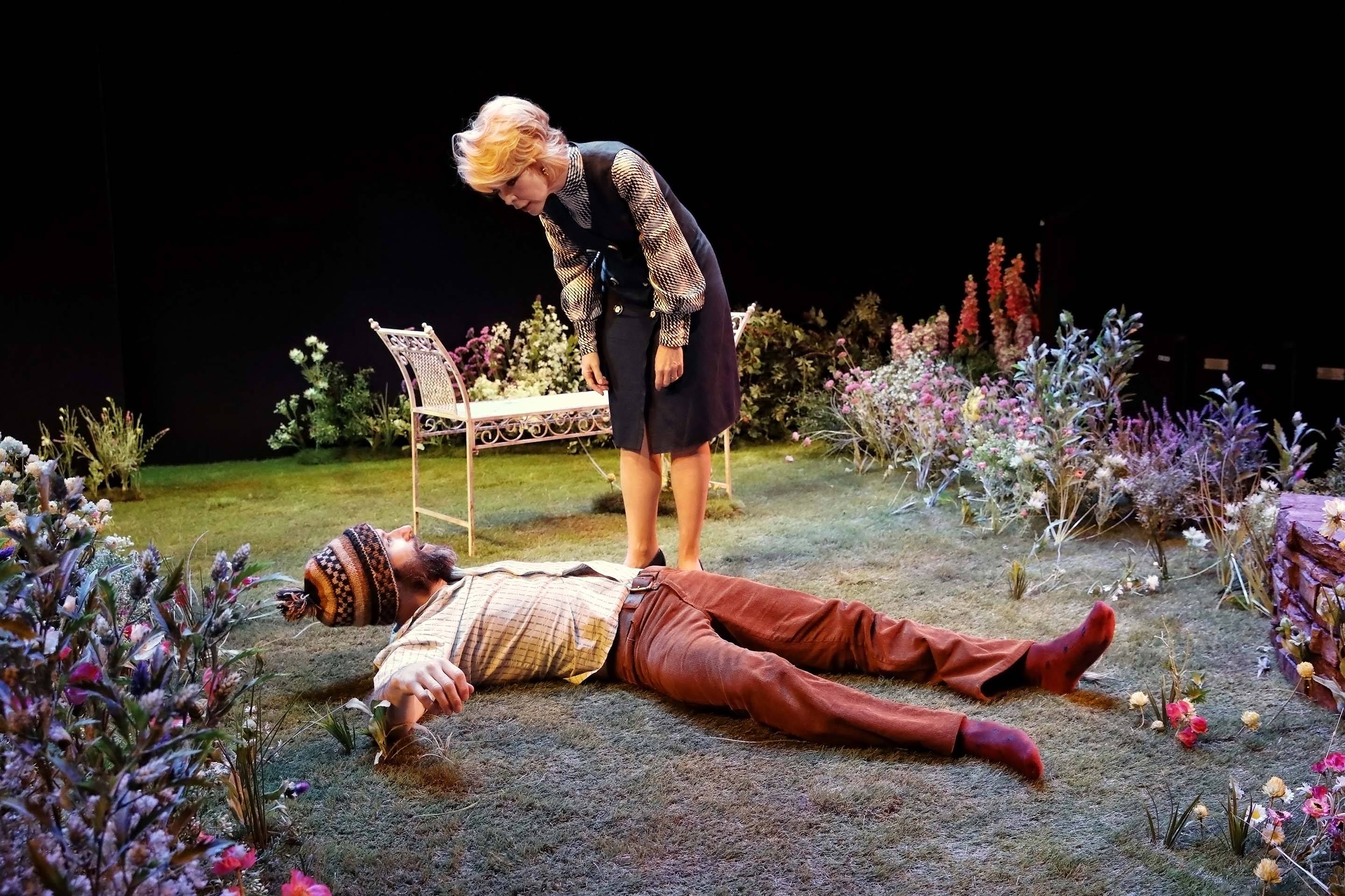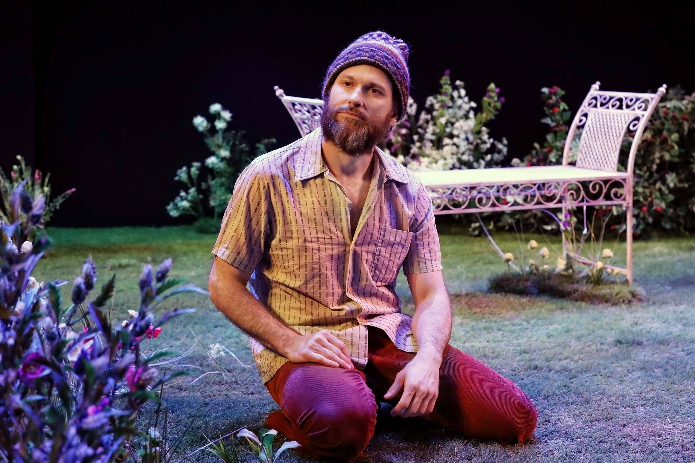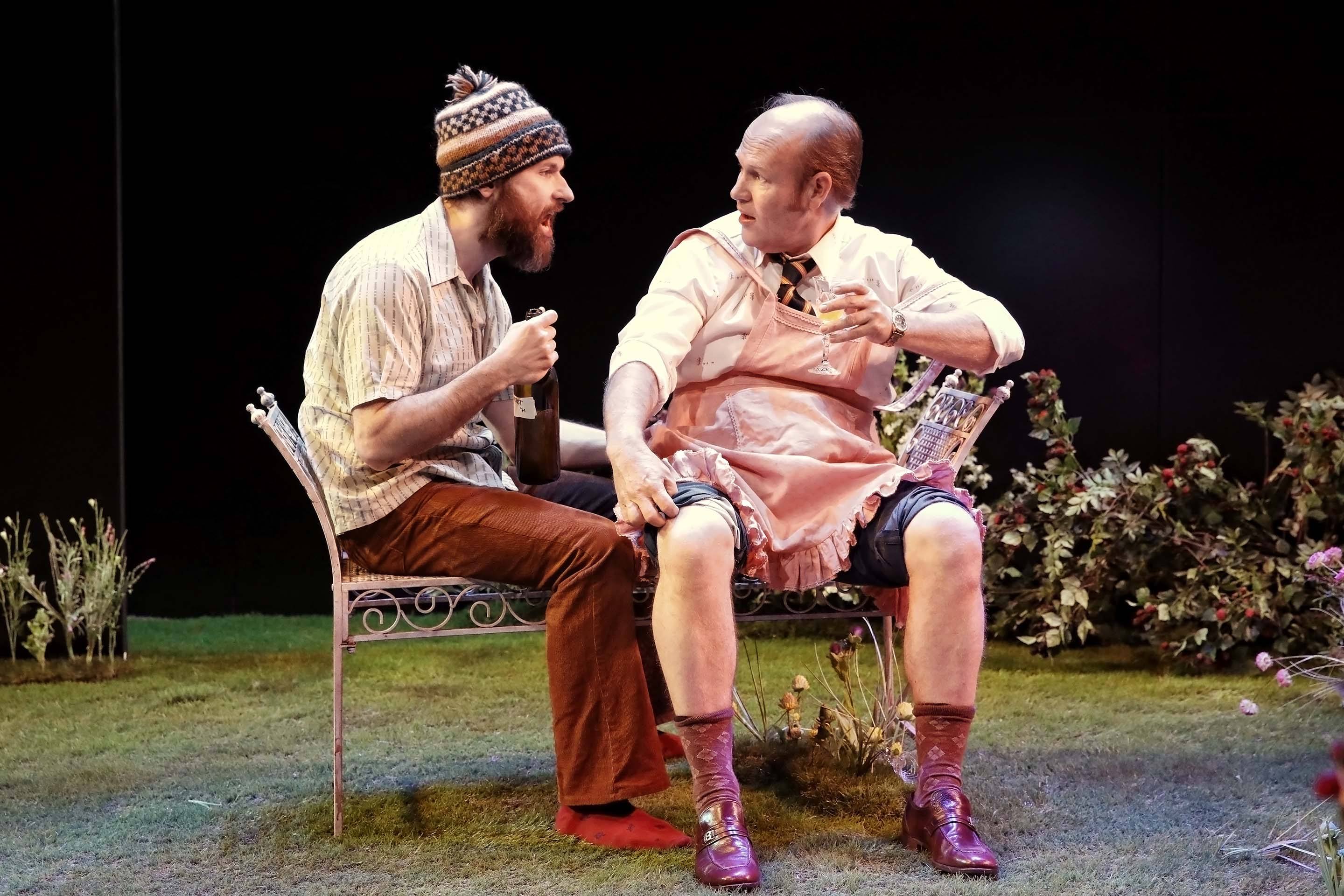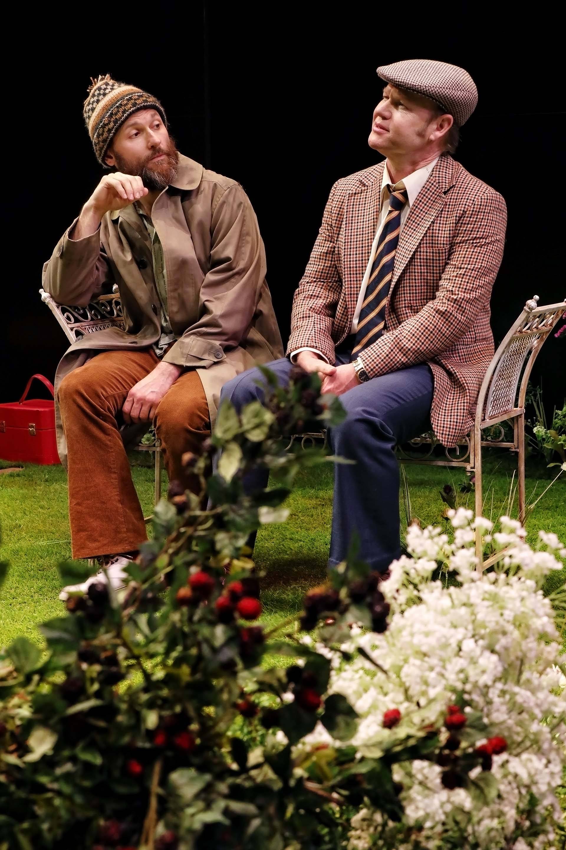 A woman stands in a garden setting, looking down with concern at a man lying on the grass. The man is wearing a patterned shirt and hat, whilst flowers and a bench surround them on stage. Two men sit on a garden bench surrounded by plants; one wears a knitted hat and holds a bottle, the other, in a pink apron and dress shoes, holds a glass and newspaper. They appear to be having an animated conversation. A bearded man in a knitted hat and short-sleeved shirt kneels on grass in a garden setting, surrounded by flowers, with a white metal bench and foliage in the background, under stage lighting. A man and a woman sit on wooden deckchairs on a grassy stage, surrounded by flowers. The woman smiles at the man whilst they talk, creating a relaxed outdoor scene. Two people sit on a bench in a lush, flower-filled garden under stage lighting. The scene is vibrant with various colourful flowers and greenery, and the pair appear to be engaged in a conversation. A stage set designed as a garden with green grass, colourful flowers, a white metal bench at the centre, and stepping stones leading towards it, all surrounded by darkness. A man in a beanie and beige coat smiles playfully at a woman holding a bouquet of white and pink flowers. The background is dark, highlighting the two figures. A woman in a mauve jumpsuit sits smiling on a deckchair in a garden setting, surrounded by green grass and flowers. A man in glasses holds a coiled rope and stands on a grassy stage, smiling. Behind him, a woman sits on a white bench, looking off to the side. Flowers and greenery are scattered across the stage. Two men sit on metal chairs in a garden setting. One wears a beanie, brown jacket, and corduroy trousers; the other wears a flat cap, checked blazer, blue trousers, and tie. Flowers and greenery fill the foreground. A woman with short blonde hair sits sideways on a decorative metal bench. She wears a cream jumper, a light scarf around her neck, and a brown patterned skirt, looking off to the side with a thoughtful expression.