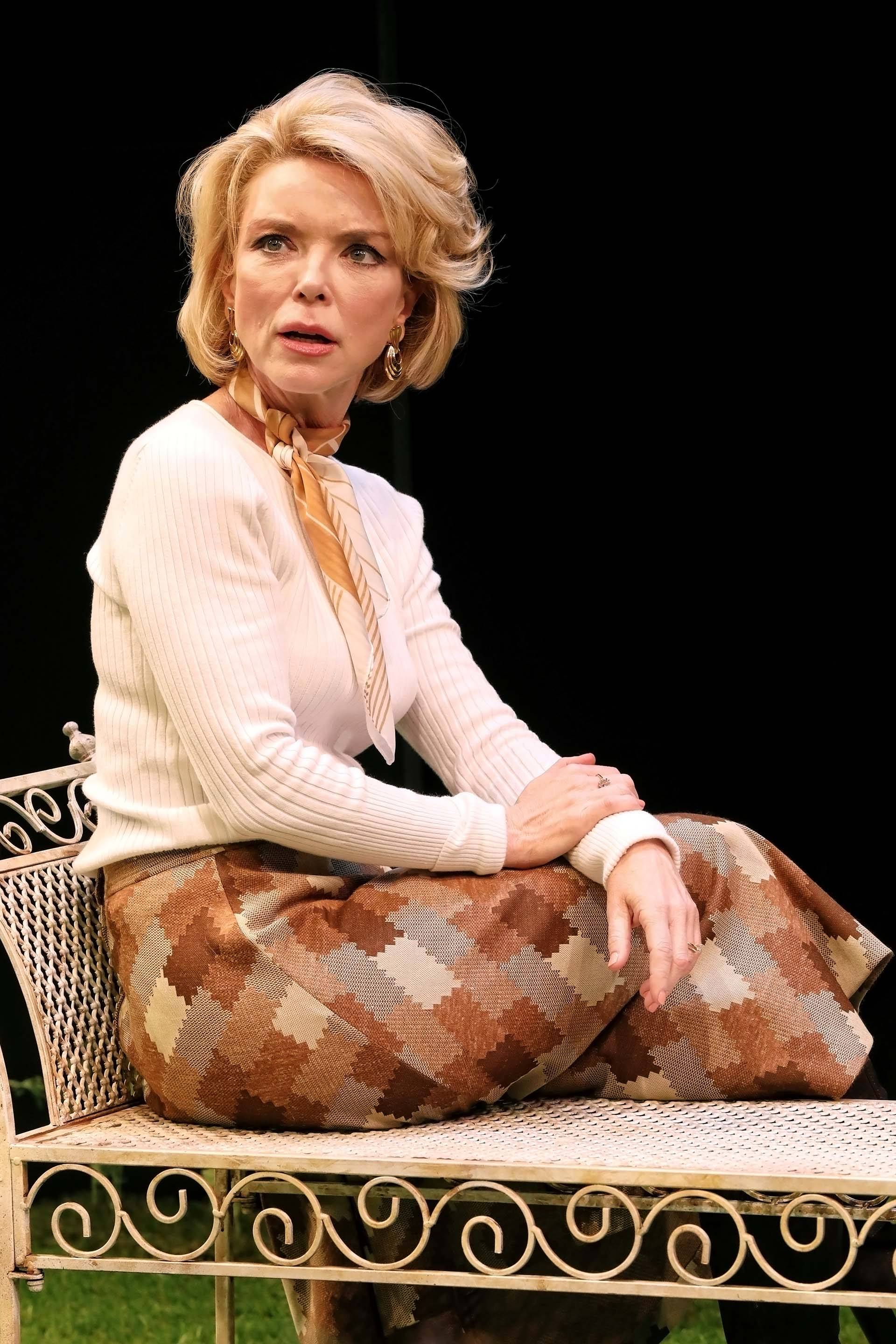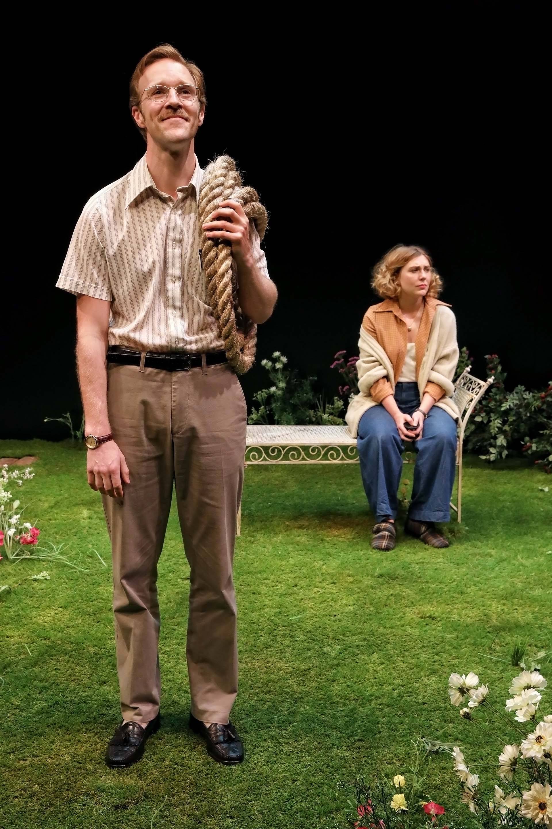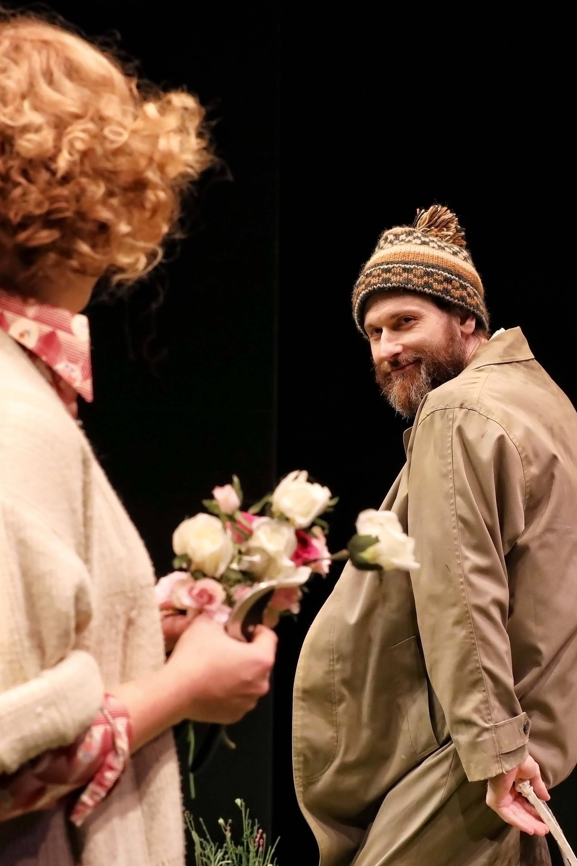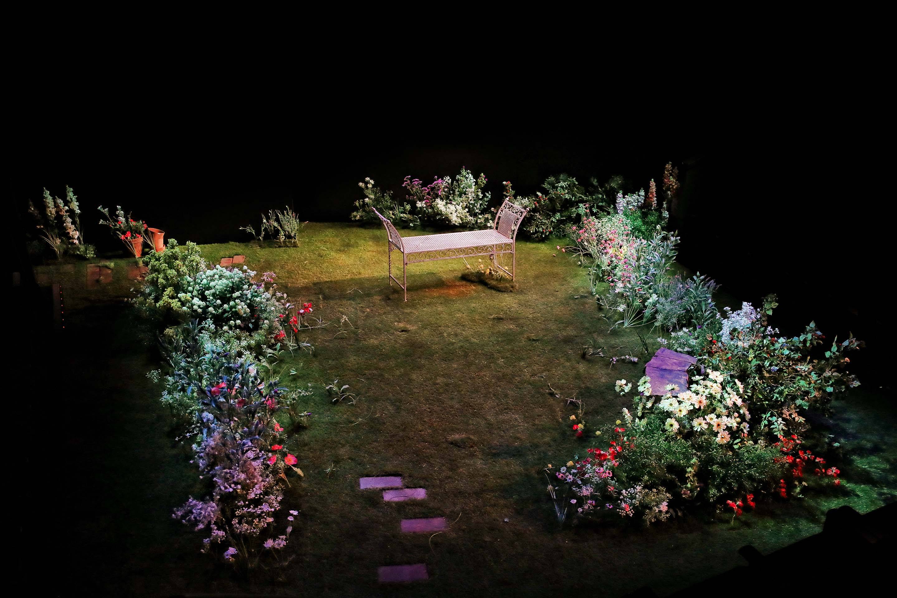 A woman stands in a garden setting, looking down with concern at a man lying on the grass. The man is wearing a patterned shirt and hat, whilst flowers and a bench surround them on stage. Two men sit on a garden bench surrounded by plants; one wears a knitted hat and holds a bottle, the other, in a pink apron and dress shoes, holds a glass and newspaper. They appear to be having an animated conversation. A bearded man in a knitted hat and short-sleeved shirt kneels on grass in a garden setting, surrounded by flowers, with a white metal bench and foliage in the background, under stage lighting. A man and a woman sit on wooden deckchairs on a grassy stage, surrounded by flowers. The woman smiles at the man whilst they talk, creating a relaxed outdoor scene. Two people sit on a bench in a lush, flower-filled garden under stage lighting. The scene is vibrant with various colourful flowers and greenery, and the pair appear to be engaged in a conversation. A stage set designed as a garden with green grass, colourful flowers, a white metal bench at the centre, and stepping stones leading towards it, all surrounded by darkness. A man in a beanie and beige coat smiles playfully at a woman holding a bouquet of white and pink flowers. The background is dark, highlighting the two figures. A woman in a mauve jumpsuit sits smiling on a deckchair in a garden setting, surrounded by green grass and flowers. A man in glasses holds a coiled rope and stands on a grassy stage, smiling. Behind him, a woman sits on a white bench, looking off to the side. Flowers and greenery are scattered across the stage. Two men sit on metal chairs in a garden setting. One wears a beanie, brown jacket, and corduroy trousers; the other wears a flat cap, checked blazer, blue trousers, and tie. Flowers and greenery fill the foreground. A woman with short blonde hair sits sideways on a decorative metal bench. She wears a cream jumper, a light scarf around her neck, and a brown patterned skirt, looking off to the side with a thoughtful expression.